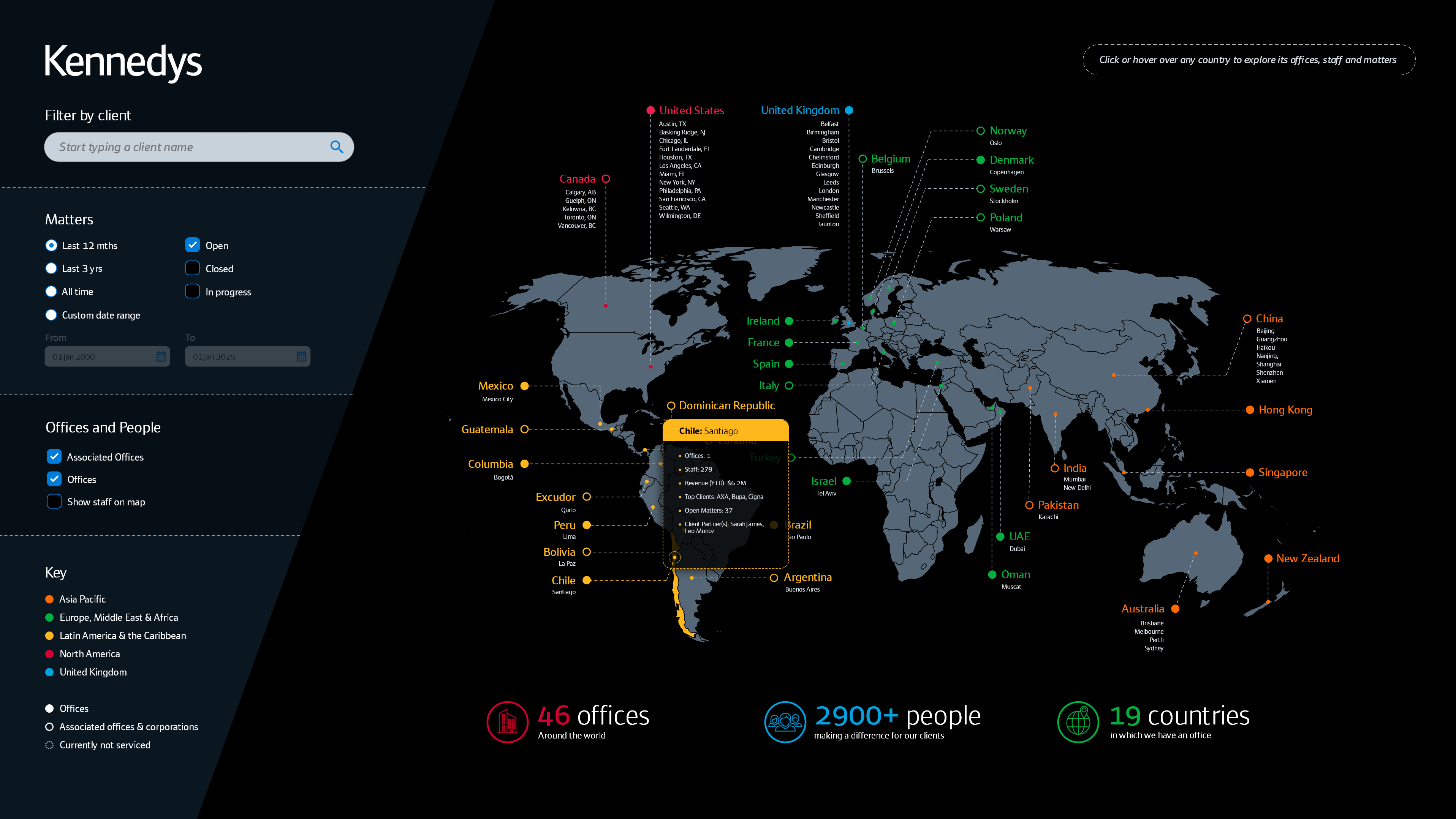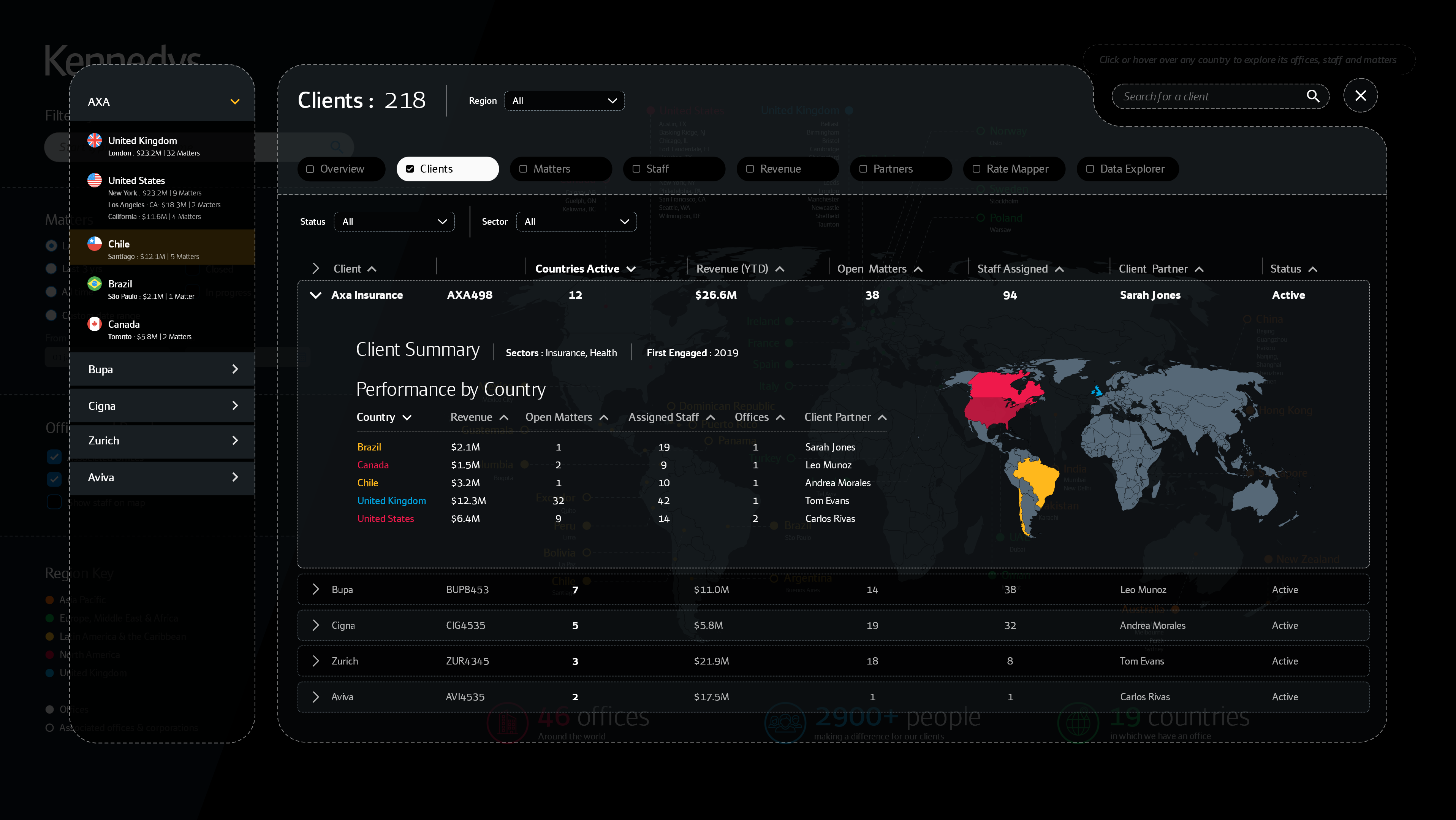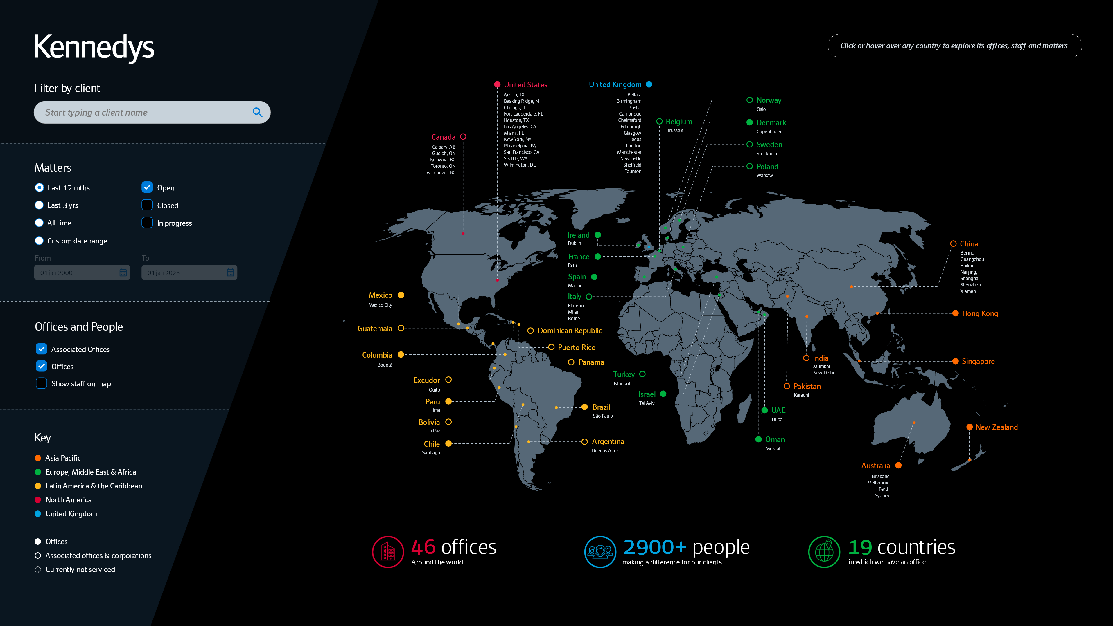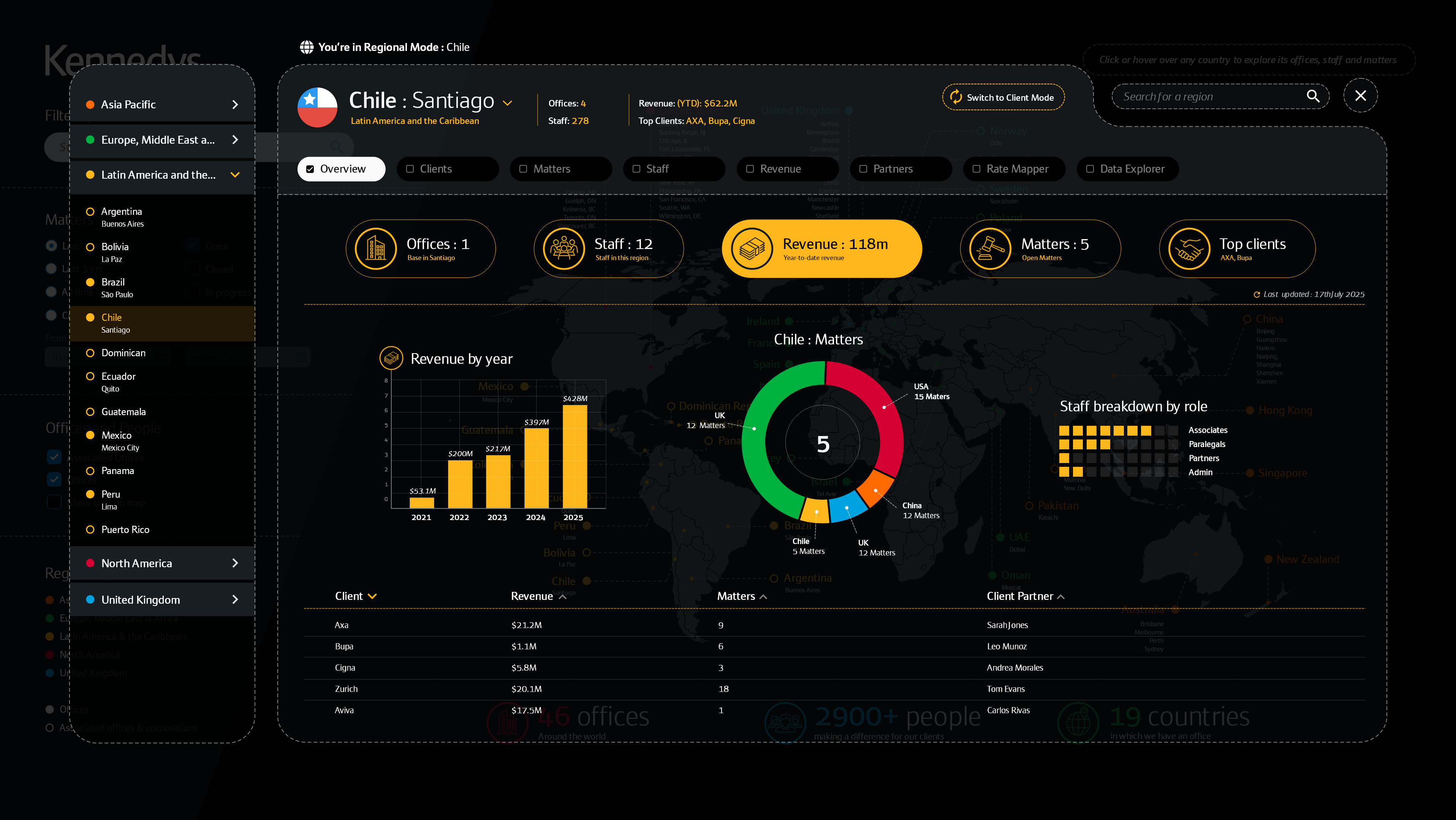 Kennedys Insight – Global Interactive Map is a data-driven platform I designed in Figma and built in Angular to give lawyers and partners an at-a-glance view of firm-wide activity across offices, staff, clients, and revenue. The application consolidates multiple legacy systems into one intuitive interface, visualising data through an interactive world map with region overlays, donut charts, and contextual dashboards. It delivers instant access to key metrics such as open matters, revenue by region, and staff distribution, streamlining business insight and strategic decision-making across 46 offices worldwide. The platform has been rolled out globally to Kennedys’ lawyers’ desktops, providing a cohesive, high-performance user experience and a single source of truth for firm analytics.